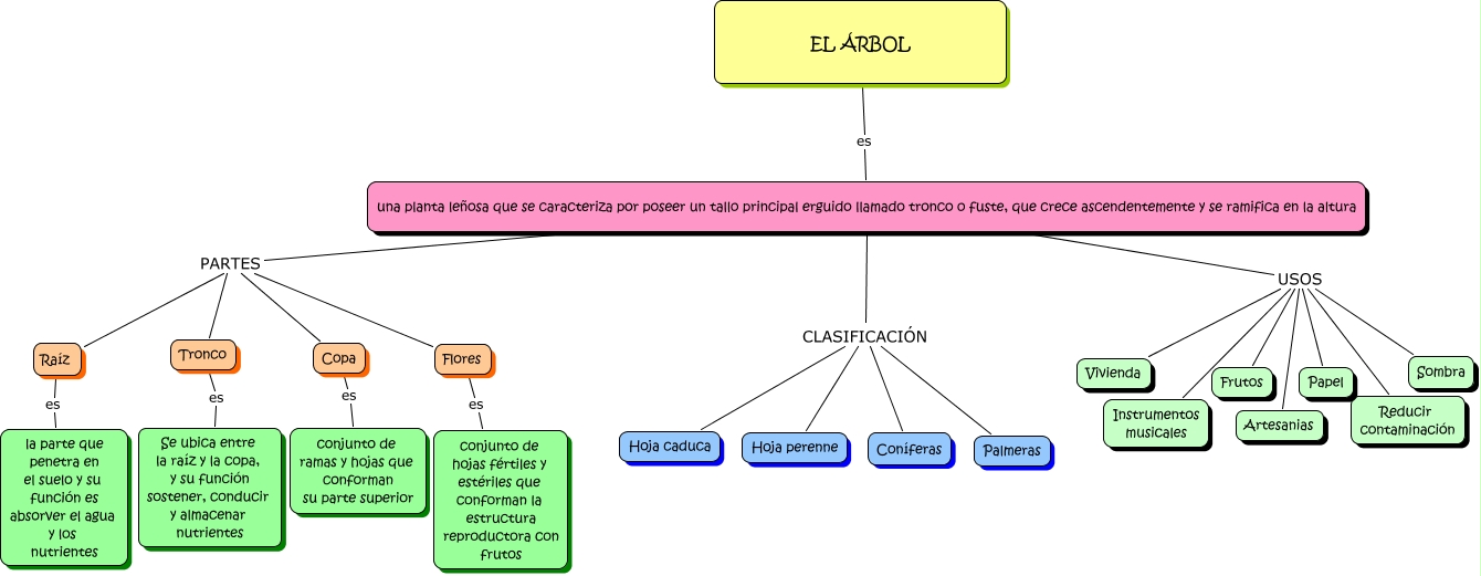 Este Cmap, tiene información relacionada con: ÁRBOL, una planta leñosa que se caracteriza por poseer un tallo principal erguido llamado tronco o fuste, que crece ascendentemente y se ramifica en la altura CLASIFICACIÓN Hoja caduca, una planta leñosa que se caracteriza por poseer un tallo principal erguido llamado tronco o fuste, que crece ascendentemente y se ramifica en la altura PARTES Raíz, una planta leñosa que se caracteriza por poseer un tallo principal erguido llamado tronco o fuste, que crece ascendentemente y se ramifica en la altura USOS Vivienda, Copa es conjunto de ramas y hojas que conforman su parte superior, Flores es conjunto de hojas fértiles y estériles que conforman la estructura reproductora con frutos, Raíz es la parte que penetra en el suelo y su función es absorver el agua y los nutrientes, una planta leñosa que se caracteriza por poseer un tallo principal erguido llamado tronco o fuste, que crece ascendentemente y se ramifica en la altura USOS Artesanias, una planta leñosa que se caracteriza por poseer un tallo principal erguido llamado tronco o fuste, que crece ascendentemente y se ramifica en la altura CLASIFICACIÓN Hoja perenne, una planta leñosa que se caracteriza por poseer un tallo principal erguido llamado tronco o fuste, que crece ascendentemente y se ramifica en la altura PARTES Tronco, una planta leñosa que se caracteriza por poseer un tallo principal erguido llamado tronco o fuste, que crece ascendentemente y se ramifica en la altura USOS Papel, una planta leñosa que se caracteriza por poseer un tallo principal erguido llamado tronco o fuste, que crece ascendentemente y se ramifica en la altura PARTES Flores, una planta leñosa que se caracteriza por poseer un tallo principal erguido llamado tronco o fuste, que crece ascendentemente y se ramifica en la altura USOS Reducir contaminación, Tronco es Se ubica entre la raíz y la copa, y su función sostener, conducir y almacenar nutrientes, una planta leñosa que se caracteriza por poseer un tallo principal erguido llamado tronco o fuste, que crece ascendentemente y se ramifica en la altura CLASIFICACIÓN Coníferas, una planta leñosa que se caracteriza por poseer un tallo principal erguido llamado tronco o fuste, que crece ascendentemente y se ramifica en la altura USOS Instrumentos musicales, una planta leñosa que se caracteriza por poseer un tallo principal erguido llamado tronco o fuste, que crece ascendentemente y se ramifica en la altura CLASIFICACIÓN Palmeras, EL ÁRBOL es una planta leñosa que se caracteriza por poseer un tallo principal erguido llamado tronco o fuste, que crece ascendentemente y se ramifica en la altura, una planta leñosa que se caracteriza por poseer un tallo principal erguido llamado tronco o fuste, que crece ascendentemente y se ramifica en la altura USOS Sombra, una planta leñosa que se caracteriza por poseer un tallo principal erguido llamado tronco o fuste, que crece ascendentemente y se ramifica en la altura USOS Frutos, una planta leñosa que se caracteriza por poseer un tallo principal erguido llamado tronco o fuste, que crece ascendentemente y se ramifica en la altura PARTES Copa