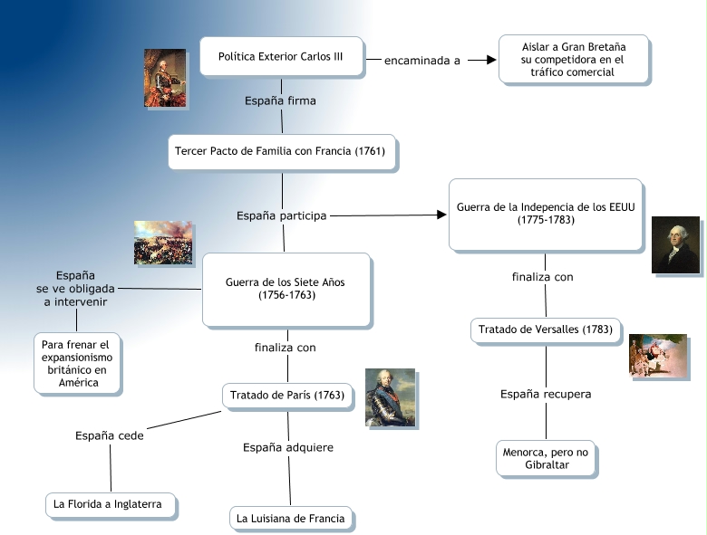 Este Cmap, tiene información relacionada con: Politica exterior durante el reinado de Carlos III, Guerra de la Indepencia de los EEUU (1775-1783) finaliza con Tratado de Versalles (1783), Guerra de los Siete Años (1756-1763) España se ve obligada a intervenir Para frenar el expansionismo británico en América, Guerra de los Siete Años (1756-1763) finaliza con Tratado de París (1763), Política Exterior Carlos III España firma Tercer Pacto de Familia con Francia (1761), Política Exterior Carlos III encaminada a Aislar a Gran Bretaña su competidora en el tráfico comercial, Tratado de París (1763) España cede La Florida a Inglaterra, Tratado de París (1763) España adquiere La Luisiana de Francia, Tratado de Versalles (1783) España recupera Menorca, pero no Gibraltar, Tercer Pacto de Familia con Francia (1761) España participa Guerra de los Siete Años (1756-1763), Tercer Pacto de Familia con Francia (1761) España participa Guerra de la Indepencia de los EEUU (1775-1783)