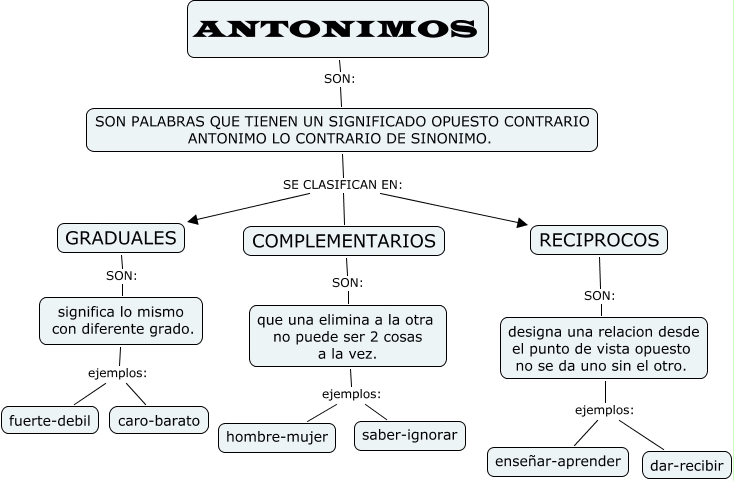 Este Cmap, tiene información relacionada con: Copia (2) de antonimos, SON PALABRAS QUE TIENEN UN SIGNIFICADO OPUESTO CONTRARIO ANTONIMO LO CONTRARIO DE SINONIMO. SE CLASIFICAN EN: GRADUALES, SON PALABRAS QUE TIENEN UN SIGNIFICADO OPUESTO CONTRARIO ANTONIMO LO CONTRARIO DE SINONIMO. SE CLASIFICAN EN: COMPLEMENTARIOS, GRADUALES SON: significa lo mismo con diferente grado., significa lo mismo con diferente grado. ejemplos: caro-barato, designa una relacion desde el punto de vista opuesto no se da uno sin el otro. ejemplos: enseñar-aprender, que una elimina a la otra no puede ser 2 cosas a la vez. ejemplos: saber-ignorar, que una elimina a la otra no puede ser 2 cosas a la vez. ejemplos: hombre-mujer, SON PALABRAS QUE TIENEN UN SIGNIFICADO OPUESTO CONTRARIO ANTONIMO LO CONTRARIO DE SINONIMO. SE CLASIFICAN EN: RECIPROCOS, significa lo mismo con diferente grado. ejemplos: fuerte-debil, RECIPROCOS SON: designa una relacion desde el punto de vista opuesto no se da uno sin el otro., designa una relacion desde el punto de vista opuesto no se da uno sin el otro. ejemplos: dar-recibir, ANTONIMOS SON: SON PALABRAS QUE TIENEN UN SIGNIFICADO OPUESTO CONTRARIO ANTONIMO LO CONTRARIO DE SINONIMO., COMPLEMENTARIOS SON: que una elimina a la otra no puede ser 2 cosas a la vez.