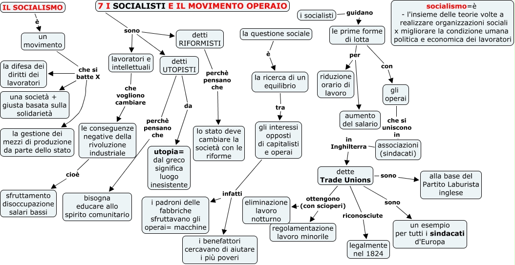 Questa Cmap, creata con IHMC CmapTools, contiene informazioni relative a: 7 I SOCIALISTI E IL MOVIMENTO OPERAIO, dette Trade Unions sono un esempio per tutti i sindacati d'Europa, la ricerca di un equilibrio tra gli interessi opposti di capitalisti e operai, detti RIFORMISTI perchè pensano che lo stato deve cambiare la società con le riforme, gli operai che si uniscono in associazioni (sindacati), associazioni (sindacati) in Inghilterra dette Trade Unions, dette Trade Unions ottengono (con scioperi) eliminazione lavoro notturno, le conseguenze negative della rivoluzione industriale cioè sfruttamento disoccupazione salari bassi, le prime forme di lotta con gli operai, un movimento che si batte X la gestione dei mezzi di produzione da parte dello stato, dette Trade Unions sono alla base del Partito Laburista inglese, la questione sociale è la ricerca di un equilibrio, gli interessi opposti di capitalisti e operai infatti i padroni delle fabbriche sfruttavano gli operai= macchine, un movimento che si batte X una società + giusta basata sulla solidarietà, le prime forme di lotta per aumento del salario, dette Trade Unions ottengono (con scioperi) regolamentazione lavoro minorile, i socialisti guidano le prime forme di lotta, 7 I SOCIALISTI E IL MOVIMENTO OPERAIO sono detti UTOPISTI, detti UTOPISTI da utopia= dal greco significa luogo inesistente, gli interessi opposti di capitalisti e operai infatti i benefattori cercavano di aiutare i più poveri, lavoratori e intellettuali che vogliono cambiare le conseguenze negative della rivoluzione industriale