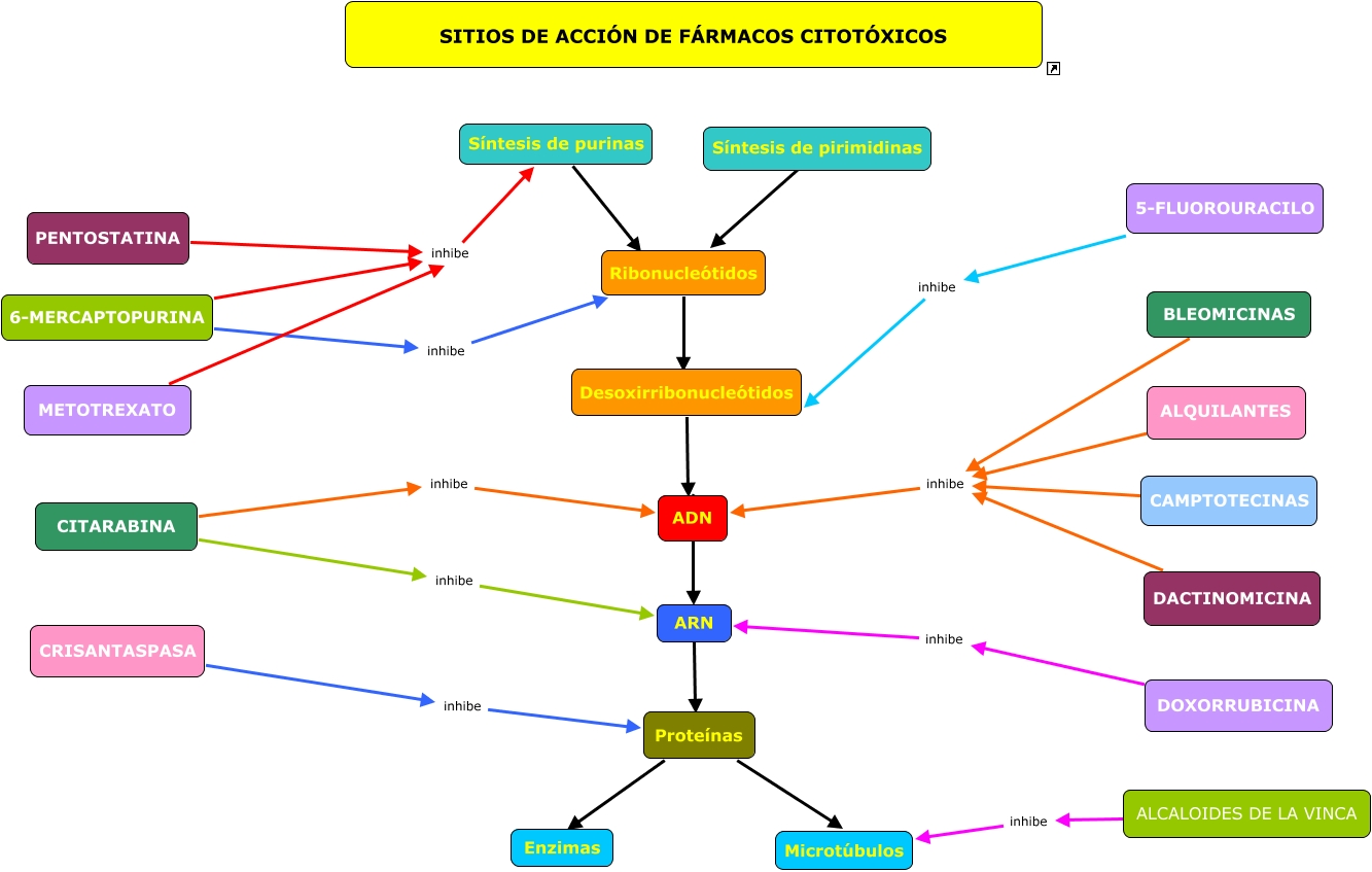 Este Cmap, tiene información relacionada con: Fármacos citotoxicos, ???? SITIOS DE ACCIÓN DE FÁRMACOS CITOTÓXICOS, CITARABINA inhibe ADN, 5-FLUOROURACILO inhibe Desoxirribonucleótidos, PENTOSTATINA inhibe Síntesis de purinas, Desoxirribonucleótidos ???? ADN, Ribonucleótidos ???? Desoxirribonucleótidos, DOXORRUBICINA inhibe ARN, 6-MERCAPTOPURINA inhibe Ribonucleótidos, Proteínas ???? Enzimas, BLEOMICINAS inhibe ADN, Proteínas ???? Microtúbulos, ALQUILANTES inhibe ADN, CAMPTOTECINAS inhibe ADN, Síntesis de purinas ???? Ribonucleótidos, Síntesis de pirimidinas ???? Ribonucleótidos, CRISANTASPASA inhibe Proteínas, METOTREXATO inhibe Síntesis de purinas, ADN ???? ARN, ARN ???? Proteínas, CITARABINA inhibe ARN