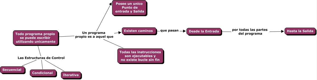 Este Cmap, tiene información relacionada con: Teoremas de la programacion Estructurada, Todo programa propio se puede escribir utilizando unicamente Un programa propio es a aquel que Todas las instrucciones son ejecutables y no existe bucle sin fin, Desde la Entrada por todas las partes del programa Hasta la Salida, Todo programa propio se puede escribir utilizando unicamente Las Estructuras de Control Condicional, Todo programa propio se puede escribir utilizando unicamente Las Estructuras de Control Secuencial, Todo programa propio se puede escribir utilizando unicamente Un programa propio es a aquel que Existen caminos, Existen caminos que pasan Desde la Entrada, Todo programa propio se puede escribir utilizando unicamente Un programa propio es a aquel que Posee un unico Punto de entrada y Salida, Todo programa propio se puede escribir utilizando unicamente Las Estructuras de Control Iterativa