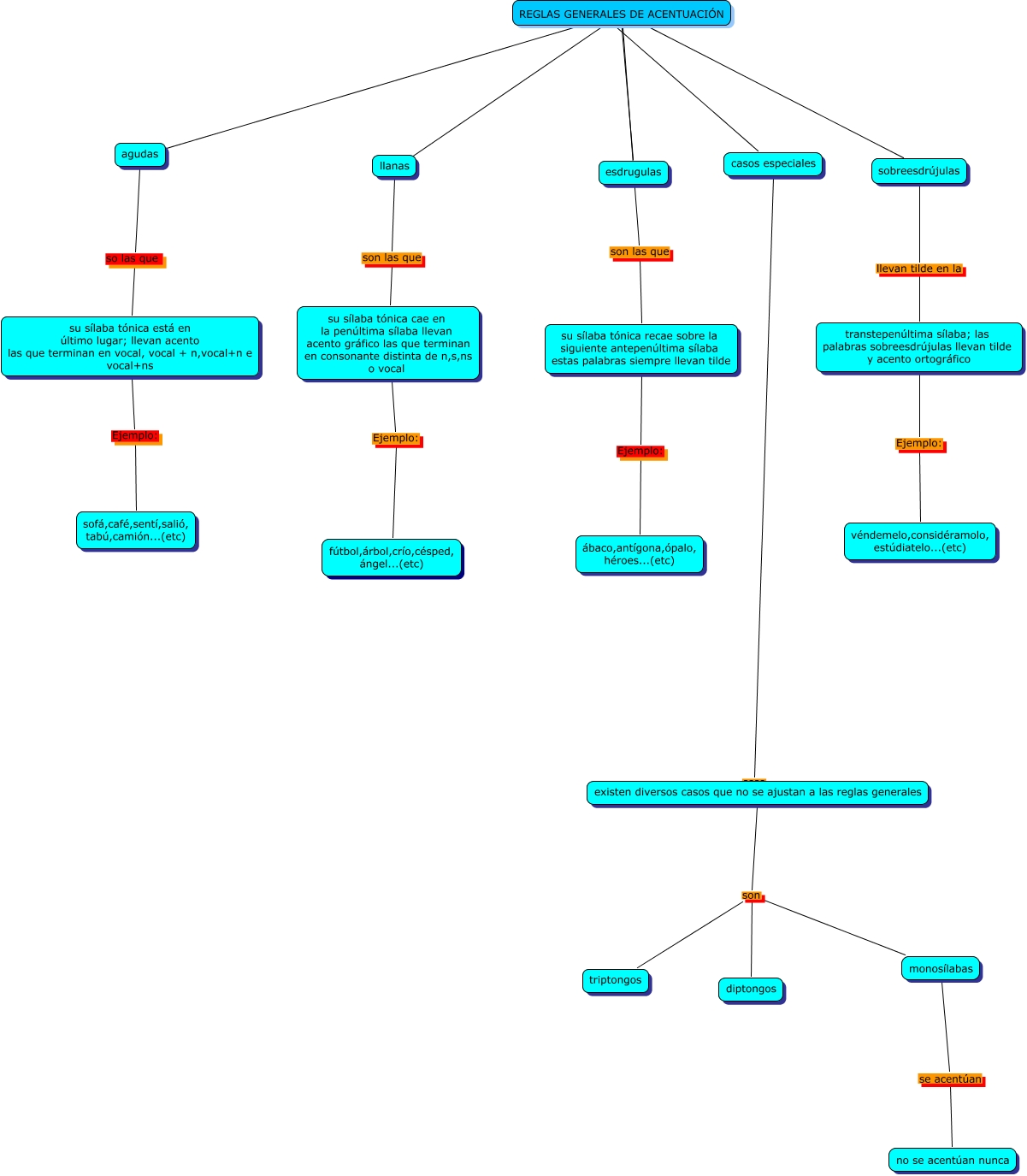 Este Cmap, tiene información relacionada con: reglas de acentuación, agudas so las que su sílaba tónica está en último lugar; llevan acento las que terminan en vocal, vocal + n,vocal+n e vocal+ns, REGLAS GENERALES DE ACENTUACIÓN ???? agudas, su sílaba tónica recae sobre la siguiente antepenúltima sílaba estas palabras siempre llevan tilde Ejemplo: ábaco,antígona,ópalo, héroes...(etc), sobreesdrújulas llevan tilde en la transtepenúltima sílaba; las palabras sobreesdrújulas llevan tilde y acento ortográfico, REGLAS GENERALES DE ACENTUACIÓN ???? esdrugulas, su sílaba tónica cae en la penúltima sílaba llevan acento gráfico las que terminan en consonante distinta de n,s,ns o vocal Ejemplo: fútbol,árbol,crío,césped, ángel...(etc), transtepenúltima sílaba; las palabras sobreesdrújulas llevan tilde y acento ortográfico Ejemplo: véndemelo,considéramolo, estúdiatelo...(etc), monosílabas se acentúan no se acentúan nunca, su sílaba tónica está en último lugar; llevan acento las que terminan en vocal, vocal + n,vocal+n e vocal+ns Ejemplo: sofá,café,sentí,salió, tabú,camión...(etc), existen diversos casos que no se ajustan a las reglas generales son triptongos, existen diversos casos que no se ajustan a las reglas generales son monosílabas, REGLAS GENERALES DE ACENTUACIÓN son las que su sílaba tónica recae sobre la siguiente antepenúltima sílaba estas palabras siempre llevan tilde, REGLAS GENERALES DE ACENTUACIÓN ???? sobreesdrújulas, existen diversos casos que no se ajustan a las reglas generales son diptongos, llanas son las que su sílaba tónica cae en la penúltima sílaba llevan acento gráfico las que terminan en consonante distinta de n,s,ns o vocal, REGLAS GENERALES DE ACENTUACIÓN ???? llanas, REGLAS GENERALES DE ACENTUACIÓN ???? casos especiales, casos especiales ???? existen diversos casos que no se ajustan a las reglas generales