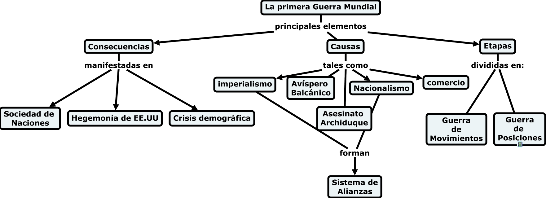 Este Cmap, tiene información relacionada con: La Primera Guerra Mundial, La primera Guerra Mundial principales elementos Causas, Causas tales como Avíspero Balcánico, Etapas divididas en: Guerra de Posiciones, Consecuencias manifestadas en Crisis demográfica, Causas tales como Asesinato Archiduque, Causas tales como Nacionalismo, imperialismo forman Sistema de Alianzas, Causas tales como imperialismo, Consecuencias manifestadas en Hegemonía de EE.UU, La primera Guerra Mundial principales elementos Etapas, Causas tales como comercio, La primera Guerra Mundial principales elementos Consecuencias, Etapas divididas en: Guerra de Movimientos, Consecuencias manifestadas en Sociedad de Naciones, Nacionalismo forman Sistema de Alianzas