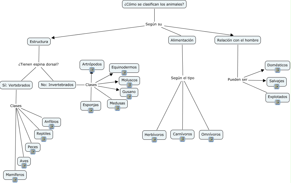 Este Cmap, tiene información relacionada con: Clasificación de animales, Relación con el hombre Pueden ser Salvajes, Estructura ¿Tienen espina dorsal? No: Invertebrados, Sí: Vertebrados Clases Aves, Relación con el hombre Pueden ser Explotados, Sí: Vertebrados Clases Anfibios, ¿Cómo se clasifican los animales? Según su Relación con el hombre, No: Invertebrados Clases Moluscos, Alimentación Según el tipo Carnívoros, Sí: Vertebrados Clases Mamíferos, Estructura ¿Tienen espina dorsal? Sí: Vertebrados, ¿Cómo se clasifican los animales? Según su Alimentación, No: Invertebrados Clases Medusas, Relación con el hombre Pueden ser Domésticos, ¿Cómo se clasifican los animales? Según su Estructura, No: Invertebrados Clases Equinodermos, No: Invertebrados Clases Esponjas, Sí: Vertebrados Clases Reptiles, Alimentación Según el tipo Herbívoros, No: Invertebrados Clases Gusano, No: Invertebrados Clases Artrópodos