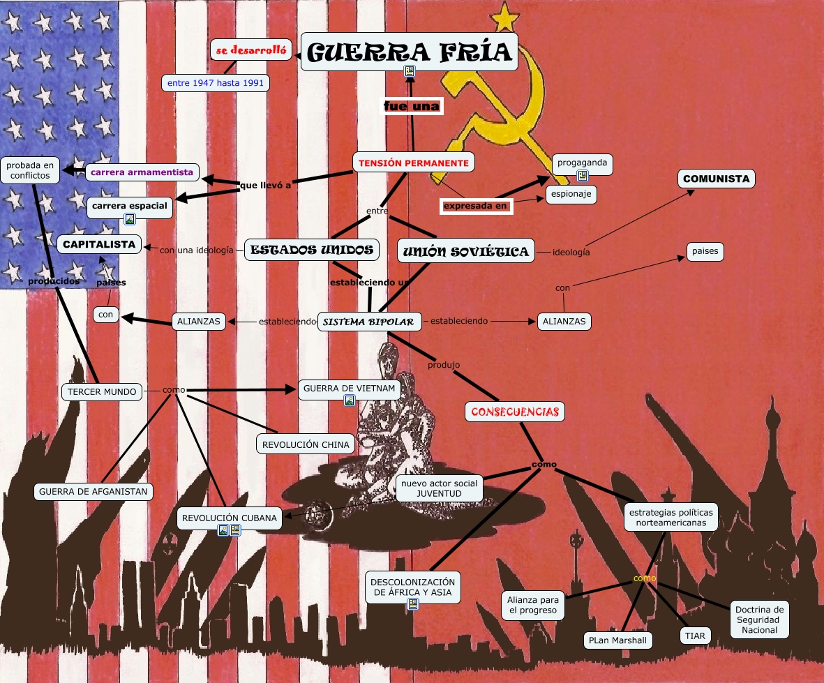 Este Cmap, tiene información relacionada con: GUERRA FRIA 3, TENSIÓN PERMANENTE fue una GUERRA FRÍA, TENSIÓN PERMANENTE expresada en progaganda, TENSIÓN PERMANENTE expresada en espionaje, ESTADOS UNIDOS con una ideología CAPITALISTA, TENSIÓN PERMANENTE que llevó a carrera espacial, CONSECUENCIAS como estrategias políticas norteamericanas, UNIÓN SOVIÉTICA ???? SISTEMA BIPOLAR, nuevo actor social JUVENTUD ???? REVOLUCIÓN CUBANA, estrategias políticas norteamericanas como TIAR, carrera armamentista ???? probada en conflictos, TERCER MUNDO como REVOLUCIÓN CHINA, probada en conflictos producidos TERCER MUNDO, TERCER MUNDO como GUERRA DE VIETNAM, ALIANZAS con paises, SISTEMA BIPOLAR estableciendo ALIANZAS, SISTEMA BIPOLAR produjo CONSECUENCIAS, TENSIÓN PERMANENTE entre UNIÓN SOVIÉTICA, con paises CAPITALISTA, TENSIÓN PERMANENTE entre ESTADOS UNIDOS, estrategias políticas norteamericanas como Doctrina de Seguridad Nacional