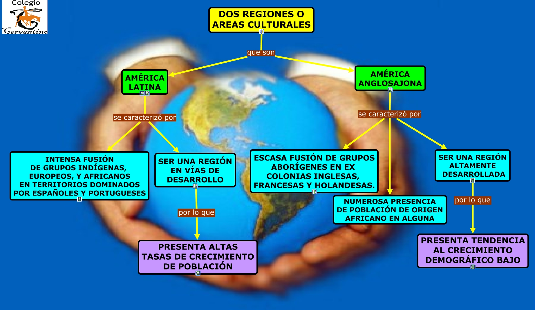 Este Cmap, tiene información relacionada con: Dos regiones, SER UNA REGIÓN EN VÍAS DE DESARROLLO por lo que PRESENTA ALTAS TASAS DE CRECIMIENTO DE POBLACIÓN, AMÉRICA ANGLOSAJONA se caracterizó por NUMEROSA PRESENCIA DE POBLACIÓN DE ORIGEN AFRICANO EN ALGUNA, AMÉRICA ANGLOSAJONA se caracterizó por SER UNA REGIÓN ALTAMENTE DESARROLLADA, AMÉRICA LATINA se caracterizó por SER UNA REGIÓN EN VÍAS DE DESARROLLO, DOS REGIONES O AREAS CULTURALES que son AMÉRICA LATINA, SER UNA REGIÓN ALTAMENTE DESARROLLADA por lo que PRESENTA TENDENCIA AL CRECIMIENTO DEMOGRÁFICO BAJO, DOS REGIONES O AREAS CULTURALES que son AMÉRICA ANGLOSAJONA, AMÉRICA LATINA se caracterizó por INTENSA FUSIÓN DE GRUPOS INDÍGENAS, EUROPEOS, Y AFRICANOS EN TERRITORIOS DOMINADOS POR ESPAÑOLES Y PORTUGUESES, AMÉRICA ANGLOSAJONA se caracterizó por ESCASA FUSIÓN DE GRUPOS ABORÍGENES EN EX COLONIAS INGLESAS, FRANCESAS Y HOLANDESAS.