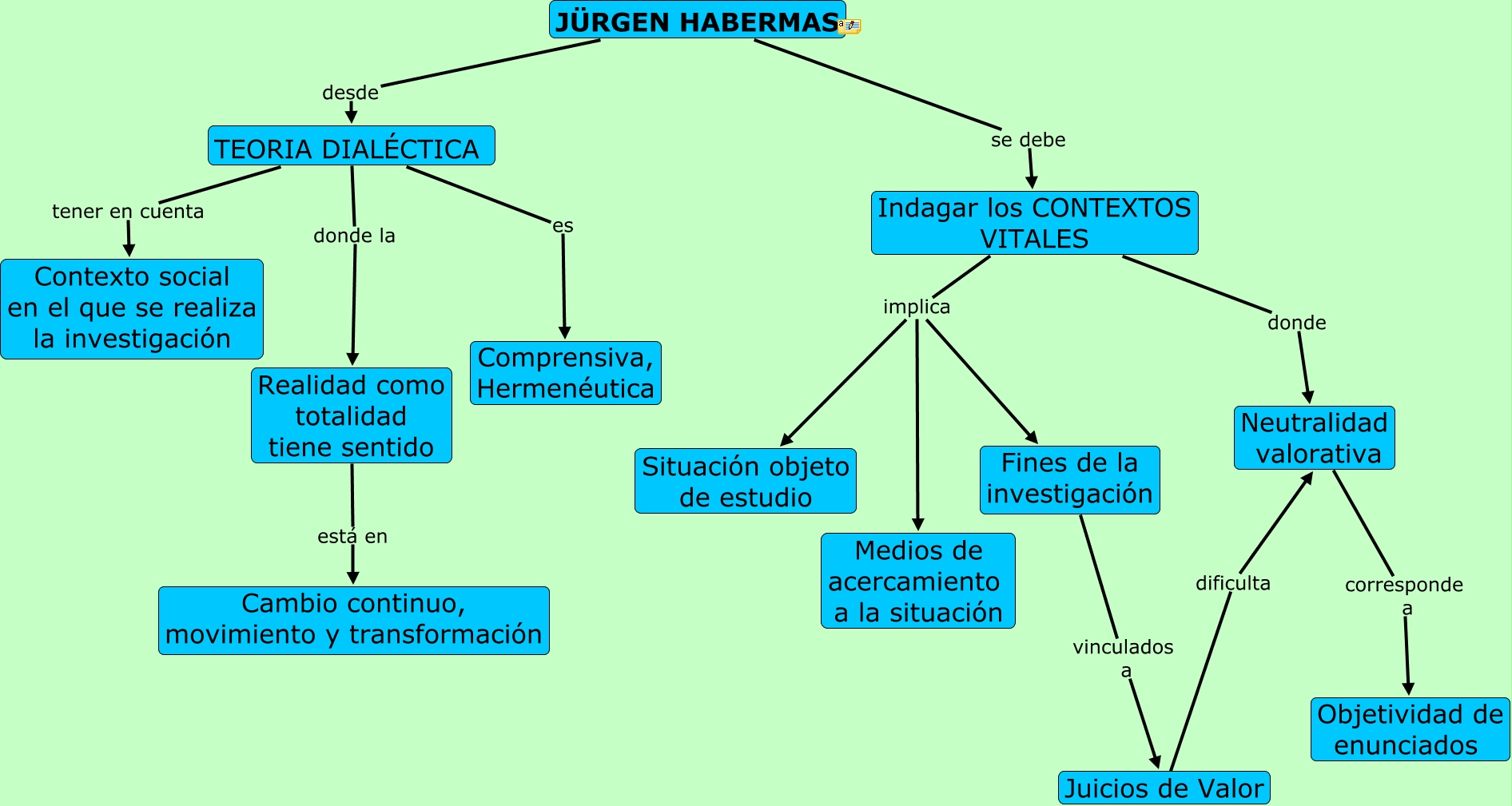 Este Cmap, tiene información relacionada con: JÜRGEN HABERMAS, TEORIA DIALÉCTICA donde la Realidad como totalidad tiene sentido, Indagar los CONTEXTOS VITALES implica Fines de la investigación, TEORIA DIALÉCTICA tener en cuenta Contexto social en el que se realiza la investigación, Fines de la investigación vinculados a Juicios de Valor, Indagar los CONTEXTOS VITALES implica Medios de acercamiento a la situación, Indagar los CONTEXTOS VITALES implica Situación objeto de estudio, Juicios de Valor dificulta Neutralidad valorativa, JÜRGEN HABERMAS se debe Indagar los CONTEXTOS VITALES, Indagar los CONTEXTOS VITALES donde Neutralidad valorativa, TEORIA DIALÉCTICA es Comprensiva, Hermenéutica, JÜRGEN HABERMAS desde TEORIA DIALÉCTICA, Neutralidad valorativa corresponde a Objetividad de enunciados, Realidad como totalidad tiene sentido está en Cambio continuo, movimiento y transformación