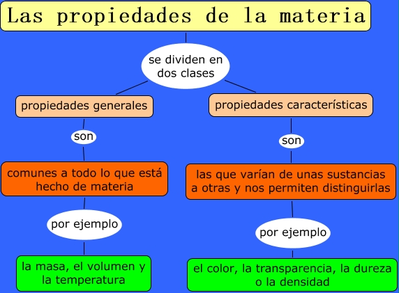 Este Cmap, tiene información relacionada con: Las propiedades de la materia, Las propiedades de la materia se dividen en dos clases propiedades características, comunes a todo lo que está hecho de materia por ejemplo la masa, el volumen y la temperatura, las que varían de unas sustancias a otras y nos permiten distinguirlas por ejemplo el color, la transparencia, la dureza o la densidad, propiedades características son las que varían de unas sustancias a otras y nos permiten distinguirlas, Las propiedades de la materia se dividen en dos clases propiedades generales, propiedades generales son comunes a todo lo que está hecho de materia