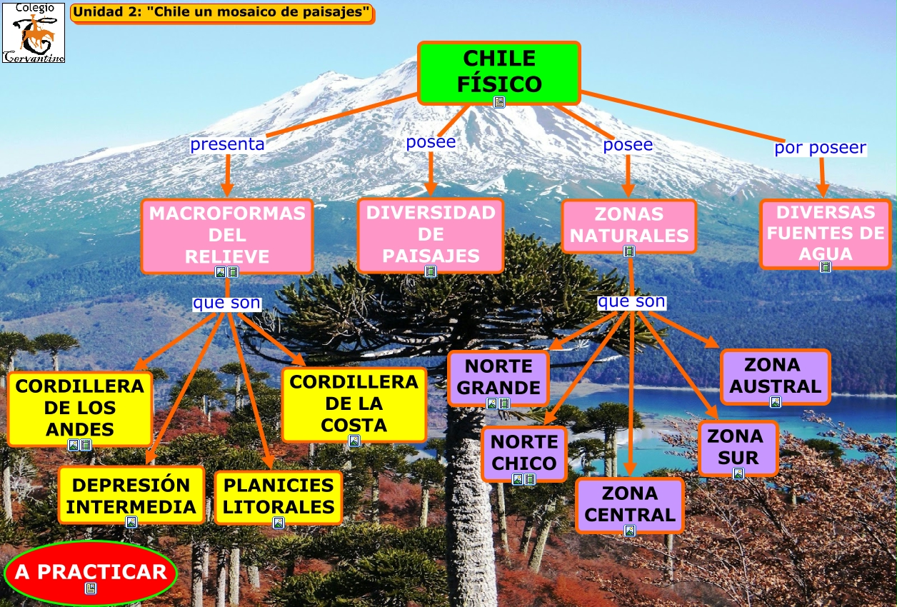 Este Cmap, tiene información relacionada con: Unidad 2 Chile un mosaico de paisajes, CHILE FÍSICO posee ZONAS NATURALES, ZONAS NATURALES que son ZONA SUR, MACROFORMAS DEL RELIEVE que son CORDILLERA DE LA COSTA, MACROFORMAS DEL RELIEVE que son DEPRESIÓN INTERMEDIA, MACROFORMAS DEL RELIEVE que son PLANICIES LITORALES, ZONAS NATURALES que son ZONA CENTRAL, CHILE FÍSICO presenta MACROFORMAS DEL RELIEVE, CHILE FÍSICO posee DIVERSIDAD DE PAISAJES, CHILE FÍSICO por poseer DIVERSAS FUENTES DE AGUA, ZONAS NATURALES que son NORTE GRANDE, ZONAS NATURALES que son NORTE CHICO, MACROFORMAS DEL RELIEVE que son CORDILLERA DE LOS ANDES, ZONAS NATURALES que son ZONA AUSTRAL