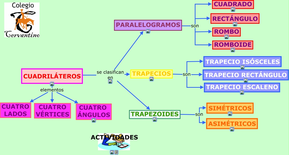 Este Cmap, tiene información relacionada con: cuadriláteros, CUADRILÁTEROS elementos CUATRO LADOS, CUADRILÁTEROS se clasifican en TRAPEZOIDES, PARALELOGRAMOS son ROMBO, TRAPEZOIDES son SIMÉTRICOS, PARALELOGRAMOS son ROMBOIDE, CUADRILÁTEROS se clasifican en TRAPECIOS, CUADRILÁTEROS elementos CUATRO ÁNGULOS, TRAPEZOIDES son ASIMÉTRICOS, TRAPECIOS son TRAPECIO ISÓSCELES, CUADRILÁTEROS se clasifican en PARALELOGRAMOS, TRAPECIOS son TRAPECIO ESCALENO, PARALELOGRAMOS son RECTÁNGULO, CUADRILÁTEROS elementos CUATRO VÉRTICES, PARALELOGRAMOS son CUADRADO, TRAPECIOS son TRAPECIO RECTÁNGULO