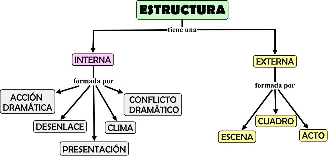 Este Cmap, tiene información relacionada con: ESTRUCTURA DEL GENERO DRAMÁTICO, ESTRUCTURA tiene una INTERNA, EXTERNA formada por CUADRO, ESTRUCTURA tiene una EXTERNA, INTERNA formada por DESENLACE, INTERNA formada por CLIMA, EXTERNA formada por ACTO, INTERNA formada por PRESENTACIÓN, EXTERNA formada por ESCENA, INTERNA formada por ACCIÓN DRAMÁTICA, INTERNA formada por CONFLICTO DRAMÁTICO