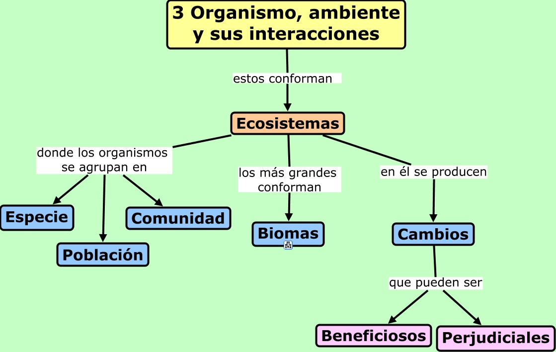 Este Cmap, tiene información relacionada con: Unidad 3 Organismo ambiente y sus interacciones, 3 Organismo, ambiente y sus interacciones estos conforman Ecosistemas, Ecosistemas los más grandes conforman Biomas, Ecosistemas en él se producen Cambios, Ecosistemas donde los organismos se agrupan en Comunidad, Ecosistemas donde los organismos se agrupan en Población, Ecosistemas donde los organismos se agrupan en Especie, Cambios que pueden ser Beneficiosos, Cambios que pueden ser Perjudiciales