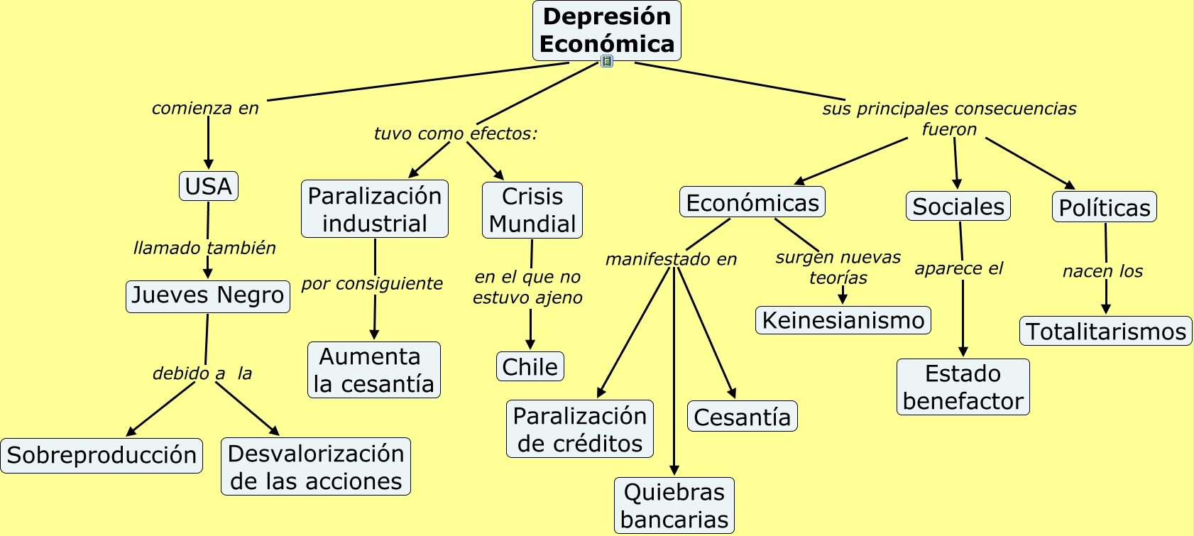 Este Cmap, tiene información relacionada con: Depresión Económica, Depresión Económica comienza en USA, Depresión Económica sus principales consecuencias fueron Políticas, Económicas manifestado en Quiebras bancarias, Depresión Económica tuvo como efectos: Paralización industrial, Sociales aparece el Estado benefactor, Económicas manifestado en Cesantía, Jueves Negro debido a la Desvalorización de las acciones, Crisis Mundial en el que no estuvo ajeno Chile, Depresión Económica sus principales consecuencias fueron Sociales, Políticas nacen los Totalitarismos, Económicas manifestado en Paralización de créditos, Depresión Económica sus principales consecuencias fueron Económicas, Depresión Económica tuvo como efectos: Crisis Mundial, Jueves Negro debido a la Sobreproducción, Paralización industrial por consiguiente Aumenta la cesantía, Económicas surgen nuevas teorías Keinesianismo, USA llamado también Jueves Negro