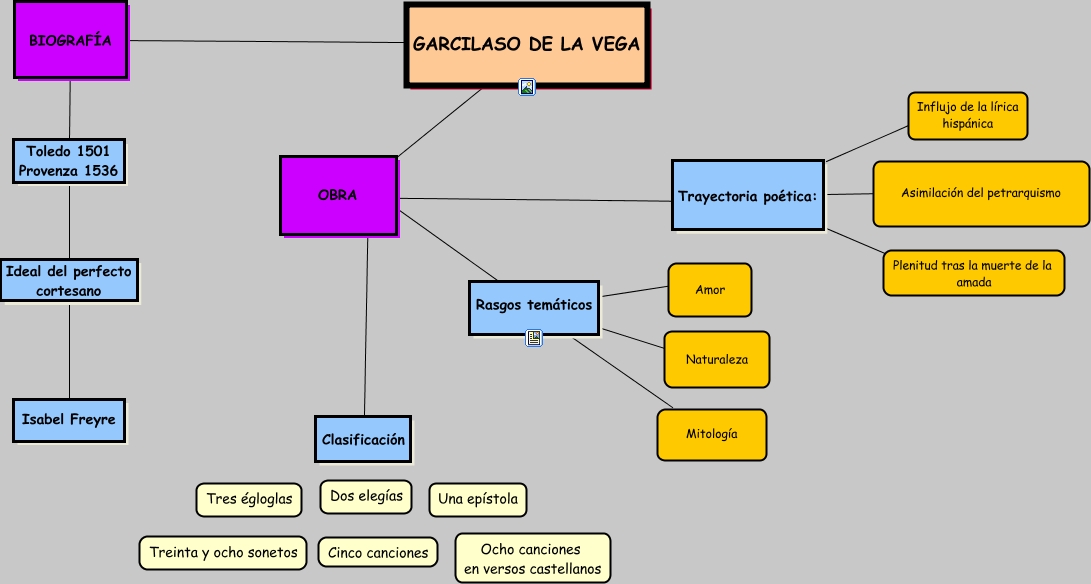 Este Cmap, tiene información relacionada con: Garcilaso de la Vega, OBRA ???? Clasificación, GARCILASO DE LA VEGA ???? ????, Ideal del perfecto cortesano ???? Isabel Freyre, Trayectoria poética: ???? Asimilación del petrarquismo, Rasgos temáticos ???? Mitología, BIOGRAFÍA ???? Toledo 1501 Provenza 1536, Trayectoria poética: ???? Plenitud tras la muerte de la amada, OBRA ???? ????, GARCILASO DE LA VEGA ???? BIOGRAFÍA, Trayectoria poética: ???? Influjo de la lírica hispánica, Rasgos temáticos ???? Naturaleza, Rasgos temáticos ???? Amor, Toledo 1501 Provenza 1536 ???? Ideal del perfecto cortesano, OBRA ???? ????