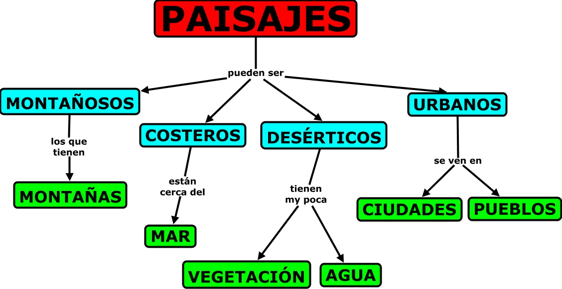 Este Cmap, tiene información relacionada con: tipos paisajes, PAISAJES pueden ser COSTEROS, PAISAJES pueden ser MONTAÑOSOS, PAISAJES pueden ser DESÉRTICOS, MONTAÑOSOS los que tienen MONTAÑAS, DESÉRTICOS tienen my poca AGUA, URBANOS se ven en PUEBLOS, COSTEROS están cerca del MAR, DESÉRTICOS tienen my poca VEGETACIÓN, PAISAJES pueden ser URBANOS, URBANOS se ven en CIUDADES