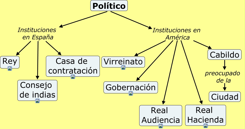 Este Cmap, tiene información relacionada con: Político, Político Instituciones en América Real Audiencia, Político Instituciones en América Virreinato, Cabildo preocupado de la Ciudad, Político Instituciones en España Consejo de indias, Político Instituciones en América Gobernación, Político Instituciones en España Rey, Político Instituciones en América Cabildo, Político Instituciones en América Real Hacienda, Político Instituciones en España Casa de contratación