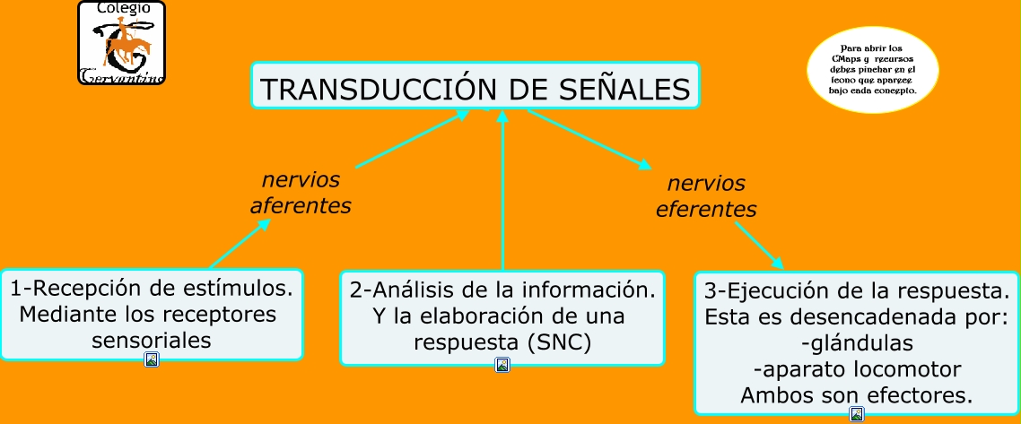 Este Cmap, tiene información relacionada con: 3.5 TRANSDUCCIÓN DE SEÑALES, 1-Recepción de estímulos. Mediante los receptores sensoriales nervios aferentes TRANSDUCCIÓN DE SEÑALES, TRANSDUCCIÓN DE SEÑALES nervios eferentes 3-Ejecución de la respuesta. Esta es desencadenada por: -glándulas -aparato locomotor Ambos son efectores., 2-Análisis de la información. Y la elaboración de una respuesta (SNC) ???? TRANSDUCCIÓN DE SEÑALES