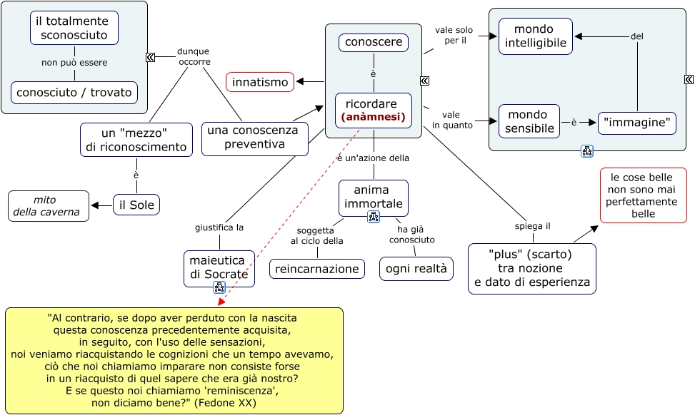 Questa Cmap, creata con IHMC CmapTools, contiene informazioni relative a: 08f Platone - Reminiscenza, il Sole mito della caverna, ???? dunque occorre una conoscenza preventiva, anima immortale soggetta al ciclo della reincarnazione, ricordare (anàmnesi) "Al contrario, se dopo aver perduto con la nascita questa conoscenza precedentemente acquisita, in seguito, con l'uso delle sensazioni, noi veniamo riacquistando le cognizioni che un tempo avevamo, ciò che noi chiamiamo imparare non consiste forse in un riacquisto di quel sapere che era già nostro? E se questo noi chiamiamo 'reminiscenza', non diciamo bene?" (Fedone XX), ???? giustifica la maieutica di Socrate, una conoscenza preventiva ????, "plus" (scarto) tra nozione e dato di esperienza le cose belle non sono mai perfettamente belle, ricordare (anàmnesi) è un'azione della anima immortale, il totalmente sconosciuto non può essere conosciuto / trovato, mondo sensibile è "immagine", conoscere è ricordare (anàmnesi), ???? innatismo, ???? vale solo per il mondo intelligibile, "immagine" del mondo intelligibile, ???? vale in quanto mondo sensibile, ???? dunque occorre un "mezzo" di riconoscimento, anima immortale ha già conosciuto ogni realtà, un "mezzo" di riconoscimento è il Sole, ???? spiega il "plus" (scarto) tra nozione e dato di esperienza
