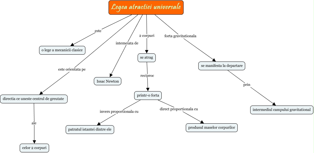This Concept Map, created with IHMC CmapTools, has information related to: Legea atractiei universale, Legea atractiei universale este o lege a mecanicii clasice, Legea atractiei universale este orientata pe directia ce uneste centrul de greutate, directia ce uneste centrul de greutate ale celor 2 corpuri, Legea atractiei universale 2 corpuri se atrag, printr-o forta direct proportionala cu produsul maselor corpurilor, se manifesta la departare prin intermediul campului gravitational, Legea atractiei universale intemeiata de Issac Newton, se atrag reciproc printr-o forta, printr-o forta invers proportionala cu patratul istantei dintre ele, Legea atractiei universale forta gravitationala se manifesta la departare