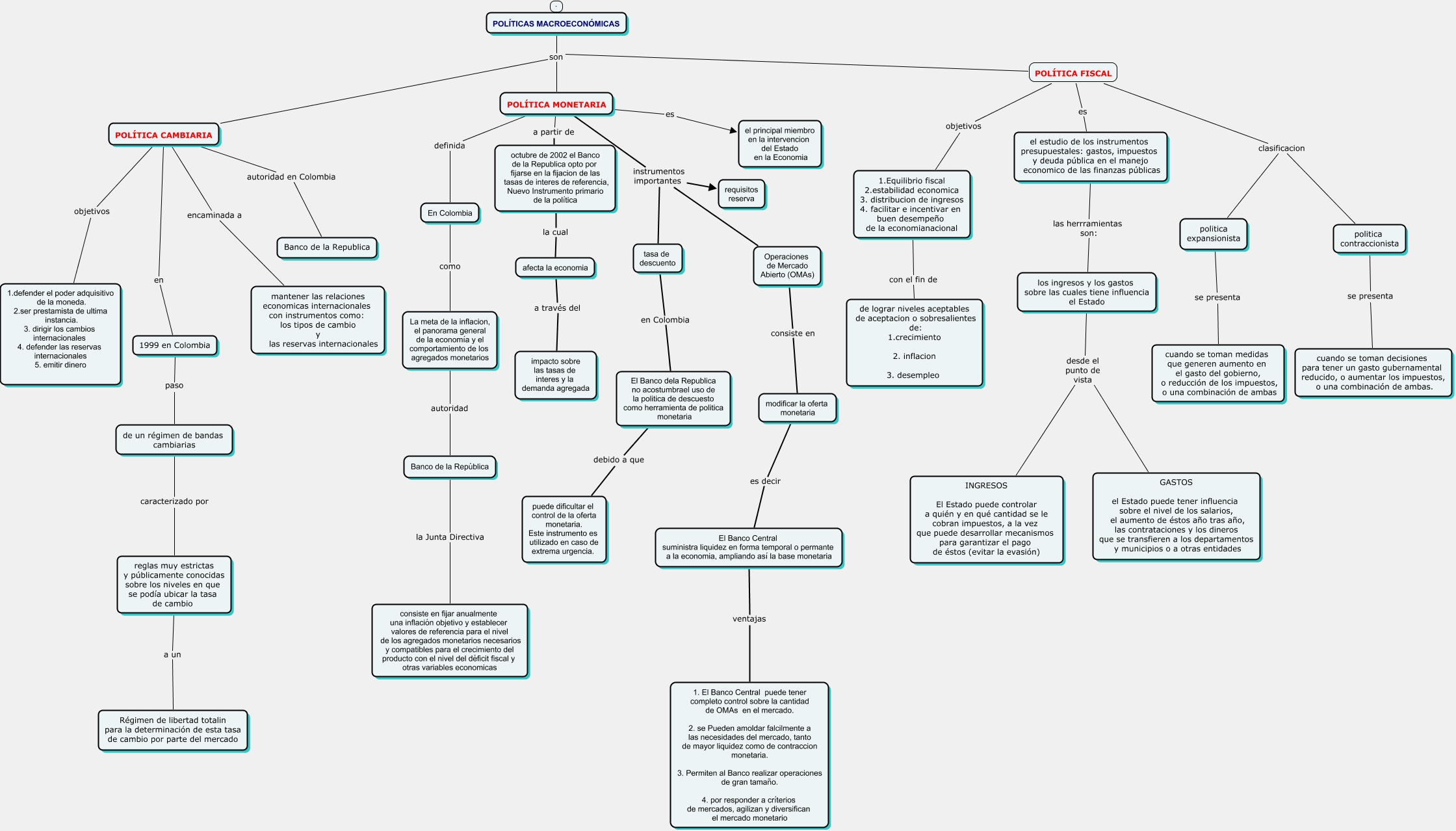 Este Cmap, tiene información relacionada con: politicas economicas, POLÍTICA CAMBIARIA encaminada a mantener las relaciones economicas internacionales con instrumentos como: los tipos de cambio y las reservas internacionales, POLÍTICA MONETARIA definida En Colombia, POLÍTICA FISCAL es el estudio de los instrumentos presupuestales: gastos, impuestos y deuda pública en el manejo economico de las finanzas públicas, POLÍTICA CAMBIARIA objetivos 1.defender el poder adquisitivo de la moneda. 2.ser prestamista de ultima instancia. 3. dirigir los cambios internacionales 4. defender las reservas internacionales 5. emitir dinero, afecta la economia a través del impacto sobre las tasas de interes y la demanda agregada, el estudio de los instrumentos presupuestales: gastos, impuestos y deuda pública en el manejo economico de las finanzas públicas las herrramientas son: los ingresos y los gastos sobre las cuales tiene influencia el Estado, politica contraccionista se presenta cuando se toman decisiones para tener un gasto gubernamental reducido, o aumentar los impuestos, o una combinación de ambas., En Colombia como La meta de la inflacion, el panorama general de la economía y el comportamiento de los agregados monetarios, politica expansionista se presenta cuando se toman medidas que generen aumento en el gasto del gobierno, o reducción de los impuestos, o una combinación de ambas, Operaciones de Mercado Abierto (OMAs) consiste en modificar la oferta monetaria, POLÍTICA CAMBIARIA en 1999 en Colombia, POLÍTICA MONETARIA instrumentos importantes requisitos reserva, POLÍTICA MONETARIA a partir de octubre de 2002 el Banco de la Republica opto por fijarse en la fijacion de las tasas de interes de referencia, Nuevo Instrumento primario de la política, La meta de la inflacion, el panorama general de la economía y el comportamiento de los agregados monetarios autoridad Banco de la República, tasa de descuento en Colombia El Banco dela Republica no acostumbrael uso de la politica de descuesto como herramienta de politica monetaria, El Banco dela Republica no acostumbrael uso de la politica de descuesto como herramienta de politica monetaria debido a que puede dificultar el control de la oferta monetaria. Este instrumento es utilizado en caso de extrema urgencia., El Banco Central suministra liquidez en forma temporal o permante a la economia, ampliando así la base monetaria ventajas 1. El Banco Central puede tener completo control sobre la cantidad de OMAs en el mercado. 2. se Pueden amoldar falcilmente a las necesidades del mercado, tanto de mayor liquidez como de contraccion monetaria. 3. Permiten al Banco realizar operaciones de gran tamaño. 4. por responder a críterios de mercados, agilizan y diversifican el mercado monetario, POLÍTICA MONETARIA es el principal miembro en la intervencion del Estado en la Economia, POLÍTICA FISCAL clasificacion politica contraccionista, POLÍTICA CAMBIARIA autoridad en Colombia Banco de la Republica