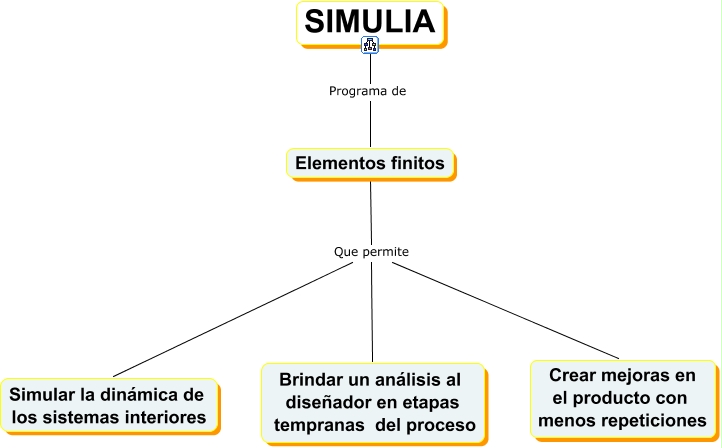 Este mapa conceptual tiene información relacionada a: F5, Elementos finitos Que permite Crear mejoras en el producto con menos repeticiones, Elementos finitos Que permite Simular la dinámica de los sistemas interiores, Elementos finitos Que permite Brindar un análisis al diseñador en etapas tempranas del proceso, SIMULIA Programa de Elementos finitos