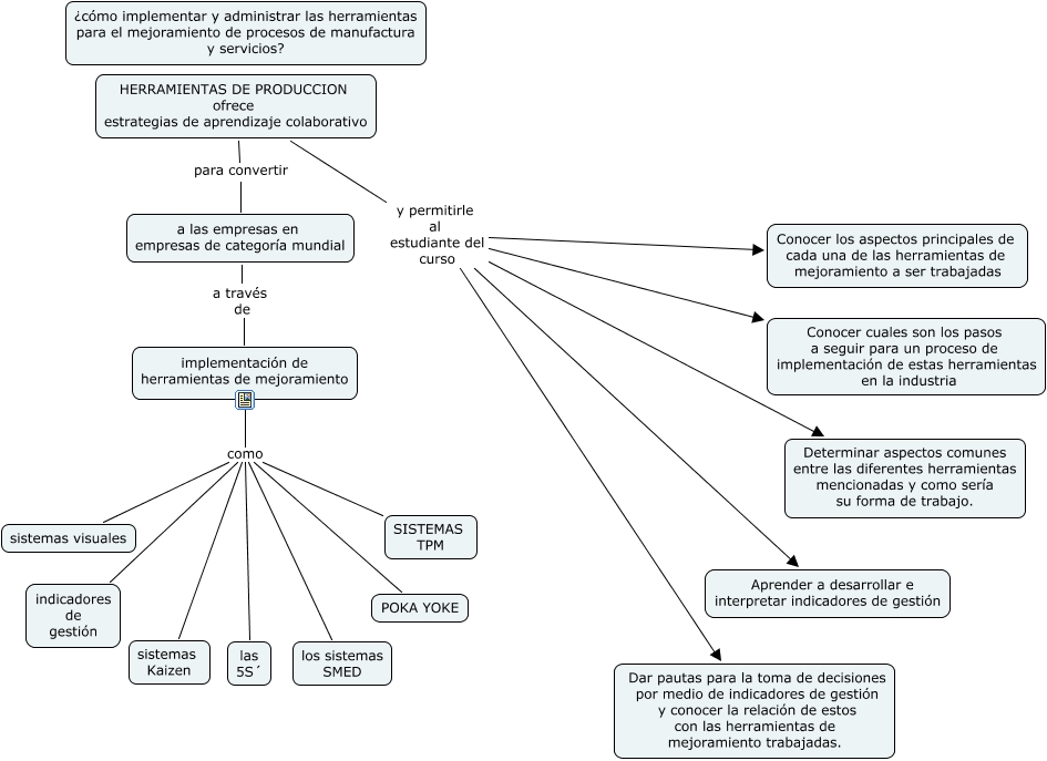 Este Cmap, tiene información relacionada con: HERRAMIENTAS DE PRODUCCION, HERRAMIENTAS DE PRODUCCION ofrece estrategias de aprendizaje colaborativo y permitirle al estudiante del curso Determinar aspectos comunes entre las diferentes herramientas mencionadas y como sería su forma de trabajo., HERRAMIENTAS DE PRODUCCION ofrece estrategias de aprendizaje colaborativo y permitirle al estudiante del curso Conocer cuales son los pasos a seguir para un proceso de implementación de estas herramientas en la industria, implementación de herramientas de mejoramiento como SISTEMAS TPM, implementación de herramientas de mejoramiento como indicadores de gestión, implementación de herramientas de mejoramiento como las 5S´, HERRAMIENTAS DE PRODUCCION ofrece estrategias de aprendizaje colaborativo y permitirle al estudiante del curso Conocer los aspectos principales de cada una de las herramientas de mejoramiento a ser trabajadas, implementación de herramientas de mejoramiento como los sistemas SMED, implementación de herramientas de mejoramiento como sistemas Kaizen, HERRAMIENTAS DE PRODUCCION ofrece estrategias de aprendizaje colaborativo para convertir a las empresas en empresas de categoría mundial, HERRAMIENTAS DE PRODUCCION ofrece estrategias de aprendizaje colaborativo y permitirle al estudiante del curso Dar pautas para la toma de decisiones por medio de indicadores de gestión y conocer la relación de estos con las herramientas de mejoramiento trabajadas., HERRAMIENTAS DE PRODUCCION ofrece estrategias de aprendizaje colaborativo y permitirle al estudiante del curso Aprender a desarrollar e interpretar indicadores de gestión, implementación de herramientas de mejoramiento como POKA YOKE, implementación de herramientas de mejoramiento como sistemas visuales, a las empresas en empresas de categoría mundial a través de implementación de herramientas de mejoramiento