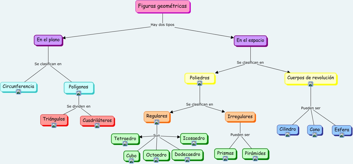 Este Cmap, tiene información relacionada con: figuras geometricas, Poliedros Se clasifican en Regulares, En el espacio Se clasifican en Poliedros, Polígonos Se dividen en Cuadriláteros, En el plano Se clasifican en Circunferencia, Regulares Son Octaedro, Cuerpos de revolución Pueden ser Cono, Regulares Son Tetraedro, Regulares Son Cubo, Cuerpos de revolución Pueden ser Esfera, Regulares Son Icosaedro, Irregulares Pueden ser Prismas, Irregulares Pueden ser Pirámides, Figuras geométricas Hay dos tipos En el espacio, Regulares Son Dodecaedro, En el plano Se clasifican en Polígonos, Cuerpos de revolución Pueden ser Cilindro, Figuras geométricas Hay dos tipos En el plano, Poliedros Se clasifican en Irregulares, Polígonos Se dividen en Triángulos, En el espacio Se clasifican en Cuerpos de revolución