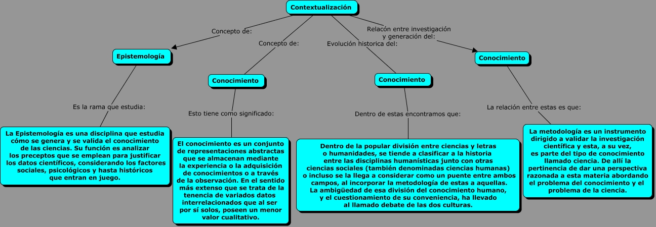 Este Cmap, tiene información relacionada con: Mapa Conceptual, Conocimiento Esto tiene como significado: El conocimiento es un conjunto de representaciones abstractas que se almacenan mediante la experiencia o la adquisición de conocimientos o a través de la observación. En el sentido más extenso que se trata de la tenencia de variados datos interrelacionados que al ser por sí solos, poseen un menor valor cualitativo., Contextualización Concepto de: Epistemología, Conocimiento La relación entre estas es que: La metodología es un instrumento dirigido a validar la investigación científica y esta, a su vez, es parte del tipo de conocimiento llamado ciencia. De allí la pertinencia de dar una perspectiva razonada a esta materia abordando el problema del conocimiento y el problema de la ciencia., Contextualización Relacón entre investigación y generación del: Conocimiento, Conocimiento Dentro de estas encontramos que: Dentro de la popular división entre ciencias y letras o humanidades, se tiende a clasificar a la historia entre las disciplinas humanísticas junto con otras ciencias sociales (también denominadas ciencias humanas) o incluso se la llega a considerar como un puente entre ambos campos, al incorporar la metodología de estas a aquellas. La ambigüedad de esa división del conocimiento humano, y el cuestionamiento de su conveniencia, ha llevado al llamado debate de las dos culturas., Contextualización Concepto de: Conocimiento, Contextualización Evolución historica del: Conocimiento, Epistemología Es la rama que estudia: La Epistemología es una disciplina que estudia cómo se genera y se valida el conocimiento de las ciencias. Su función es analizar los preceptos que se emplean para justificar los datos científicos, considerando los factores sociales, psicológicos y hasta históricos que entran en juego.